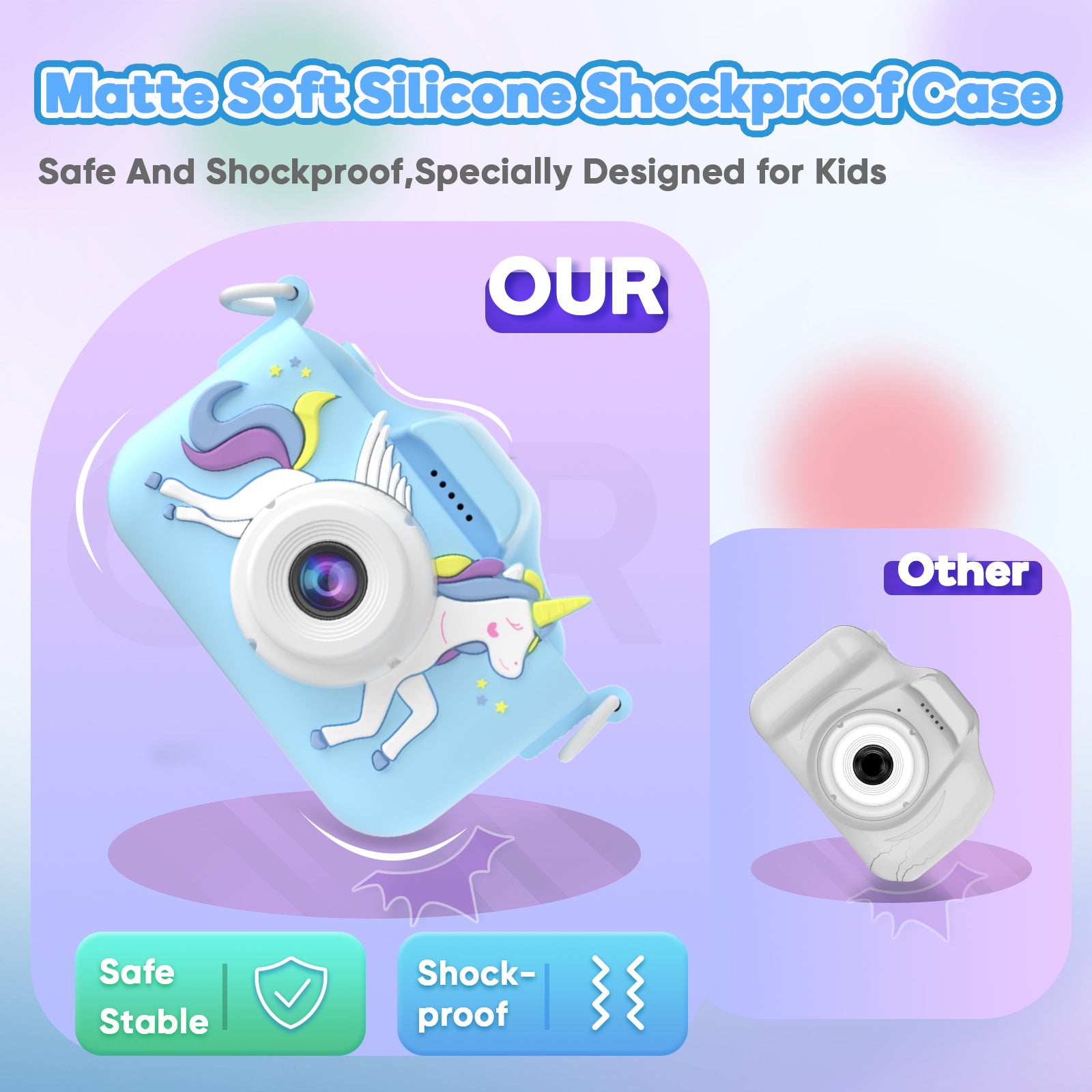【Safe & Shockproof】This camera toy uses high-quality non-toxic soft plastic, which will be safer and more comfortable for children’s skin.  The cute cartoon silicone shell allows kids to enjoy happy and freedom photography moments without the worries of being broken.