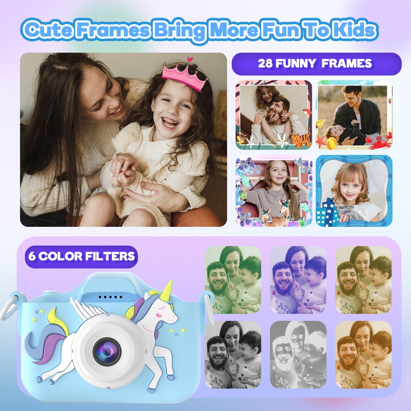 【Clearer Moment Recorded & Multi-scene Selections】- Equipped with auto Focus, 8.0 Mega pixels and 1080P Video, which hightly improved the definition of photos.  Catch the wonderful joy moment for boys or girls.  With Big head sticker shooting, children can take photos with frames and leave some hilarious photos with family or friends.